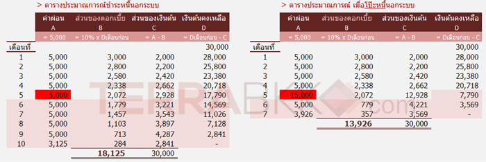 กำไรจากการขาย = 5,000 บาท > กรณีโปะหนี้ : จ่ายหนี้นอกระบบ 30,000 บาท ปกติผ่อนเดือนละ 5,000 บาท เสียดอกเบี้ยร้อยละ 10% ของเงินต้นคงเหลือเดือนก่อน ตอนนี้ผ่อนมาแล้ว 4 งวด เมื่อลองคำนวณผลตอบแทนได้ ดังนี้