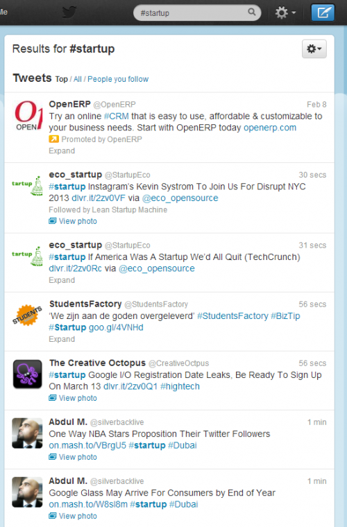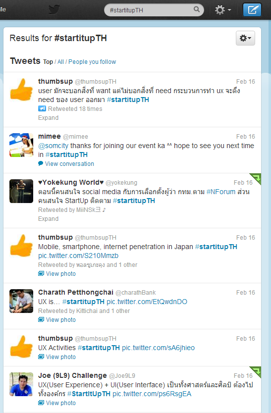 สุดท้ายก็มาตกลงกันด้วยคำว่า #startitupTH ด้วยการระบุไปว่าเป็นประเทศไทย ซึ่งก่อนที่จะใช้งานนั้นเราต้องตรวจสอบกันบน Twitter ว่ามีการใช้งานไปแล้วบ้างหรือยัง ซึ่งผลลัพธ์ก็คือยังไม่มีใครใช้ จึงเป็นที่มาของการใช้ hashtag นี้นั่นเอง