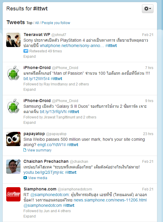 เจอความคิดเห็นหนึ่งจากที่มาของบทความดูแล้วน่าสนใจครับ เป็นเว็บที่สามารถทำให้เราเห็นข้อความทั้งหมดที่มี hashtag ที่เราสนใจอยากดู นั่นคือเว็บ?twubs.com?สามารถที่จะเข้าไปลงทะเบียน hashtag ไว้สำหรับใช้ในงานของเราโดยเฉพาะ แต่ก็เพื่อดูข้อความเพียงอย่างเดียวเท่านั้นนะครับ