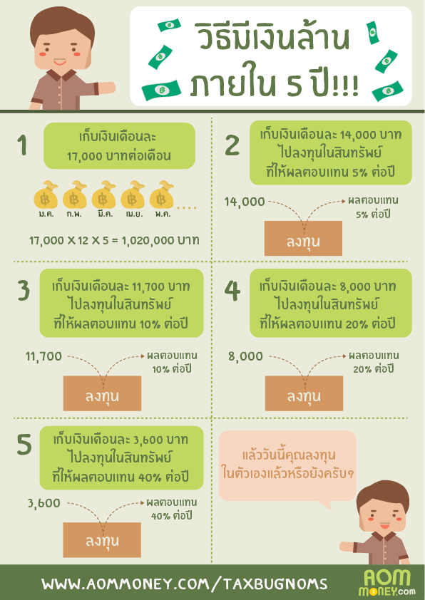 ทวนกันอีกครั้งนะครับ เงินของเราจะเพิ่มค่า โดยมีตัวแปร 3 ตัว คือ เงินต้น ระยะเวลา และผลตอบแทน แต่ในกรณีนี้เรามี เวลา คงที่ คือ 5 ปี ดังนั้นเราต้องปรับที่ เงินต้น และ ระยะเวลา แทน @Taxbugnoms เลยแบ่งออกเป็นทางเลือกให้ 5 ทาง ดังนี้คร้าบบ