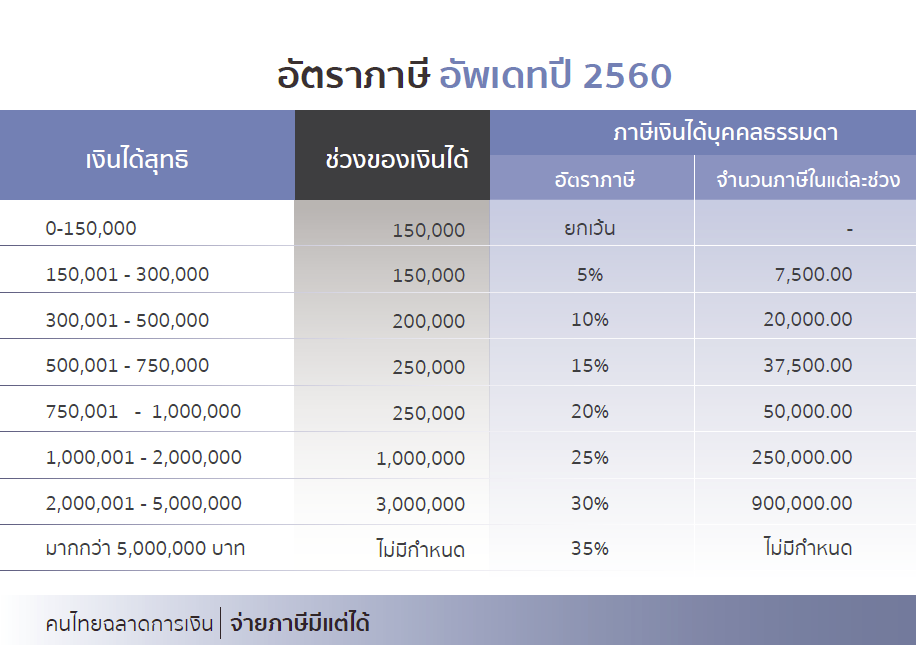 (ตารางอัตราภาษีแสดงให้เห็นว่า ยิ่งมีเงินได้สุทธิมาก ยิ่งต้องเสียภาษีมากนั่นเองครับ)