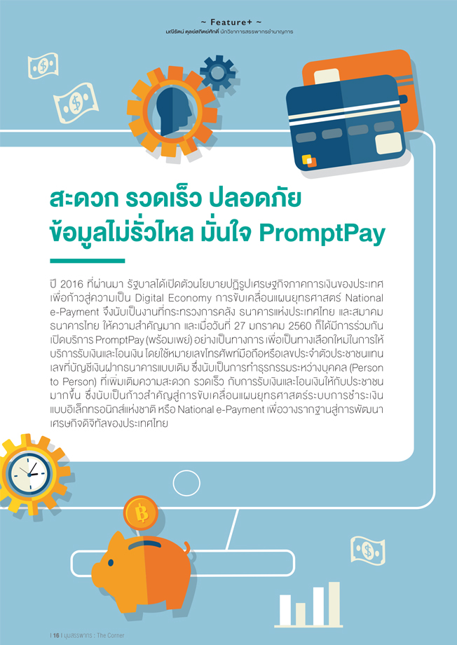 PromptPay (พร้อมเพย์) ทางเลือกใหม่ในการให้บริการรับเงินและโอนเงิน โดยใช้หมายเลขโทรศัพท์มือถือ หรือเลขประจำตัวประชาชนแทนเลขที่บัญชีเงินฝากธนาคารแบบเดิม ซึ่งนับเป็นการทำธุรกรรมระหว่างบุคคล (Person to Person) ที่เพิ่มเติมความสะดวก รวดเร็ว กับการรับเงินและโอนเงินให้กับประชาชนมากขึ้น ซึ่งนับเป็นก้าวสำคัญสู่การขับเคลื่อนแผนยุทธศาสตร์ระบบการชำระเงินแบบอิเล็กทรอนิกส์แห่งชาติ หรือ National e-Payment เพื่อวางรากฐานสู่การพัฒนาเศรษกิจดิจิทัลของประเทศไทย