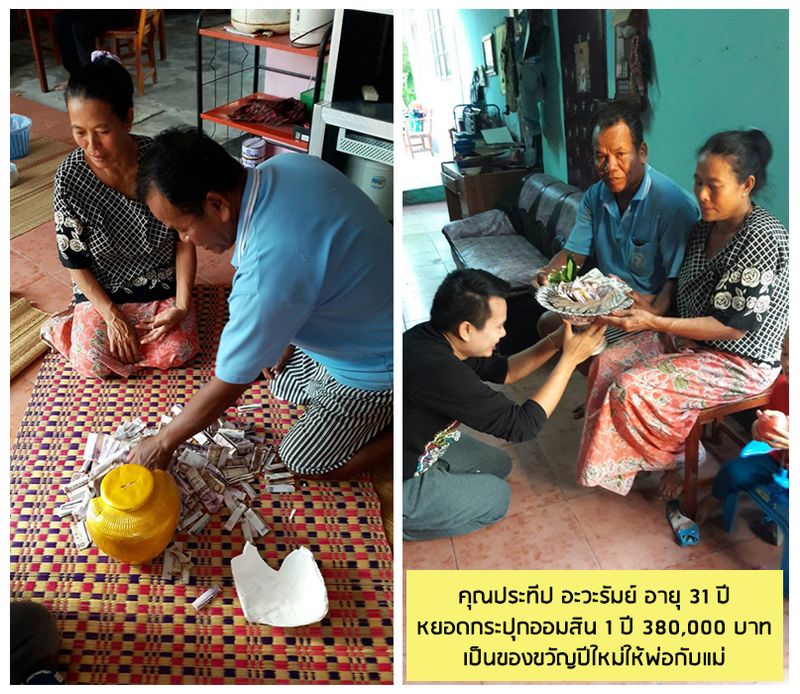 ช่วงวันปีใหม่ปี 2560 มีการแชร์คลิปทางสื่อออนไลน์ของพ่อค้าหนุ่มคนหนึ่ง แบ่งเงินที่ขายของได้มาหยอดกระปุกออมสินเพื่อเป็นของขวัญปีใหม่ให้พ่อกับแม่ สะสมเงิน 1 ปี มีเงินออมกว่า 380,000 บาท เรามาดูกันว่ากว่าจะมีวันนี้เขาต้องผ่านอะไรมาบ้างและมีวิธีการออมเงินอย่างไร