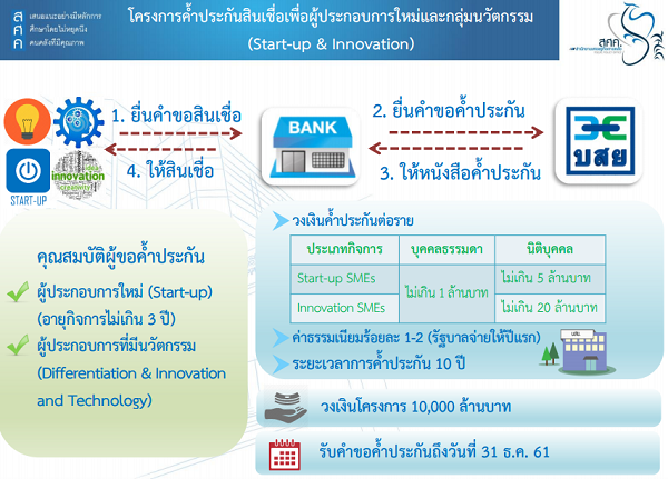 จากมติ ครม.เห็นชอบดำเนินโครงการค้ำประกันสินเชื่อ Start-up & Innovation เมื่อเดือนกรกฎาคม 2559 ที่ผ่านมา บรรษัทประกันสินเชื่ออุตสาหกรรมขนาดย่อม ( บสย. ) ได้ลงนามบันทึกข้อตกลงความร่วมมือ 17 สถาบันการเงิน ด้วยวงเงินค้ำประกันสินเชื่อรวม 10,000 ล้านบาท ระยะเวลาค้ำประกันสินเชื่อสูงสุดไม่เกิน 10 ปี ผู้ประกอบการที่สนใจเข้าร่วมโครงการสามารถยื่นขอค้ำประกันสินเชื่อได้จนถึง วันที่ 31 ธันวาคม 2561 หรือจนกว่าจะเต็มวงเงิน โดยมีข้อมูลเบื้องต้นดังนี้