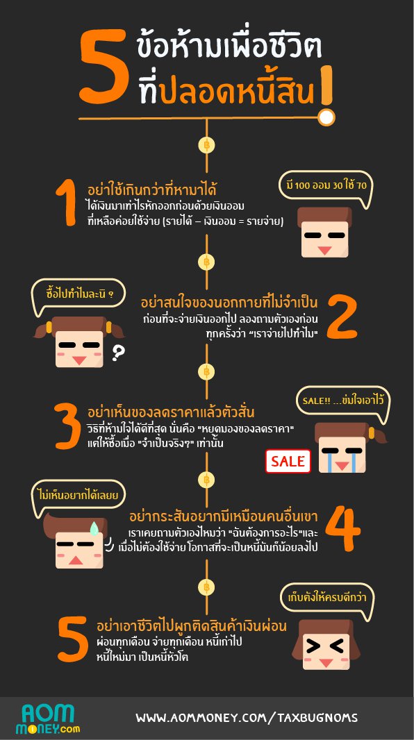 เคล็ดลับทั้ง 5 ข้อนี้ มีไว้เพื่อเตือนใจเพื่อนๆพี่ๆน้องๆ ก่อนจะตัดสินใจเป็นหนี้ แต่หนี้จะเกิดขึ้นได้นั้น มันต้องมาจากความอยากที่จะใช้จ่าย ถ้าหากแก้ปัญหาที่ตรงจุด ลดหนี้สิน เราต้องหยุดตั้งแต่ความคิดที่จะใช้จ่าย ไม่ใช่หยุดความคิดที่จะสร้างหนี้ เพราะถ้ารู้ตัวช้าแบบนั้น บางครั้งอาจจะไม่ทันการณ์นะคร้าบบบบบ